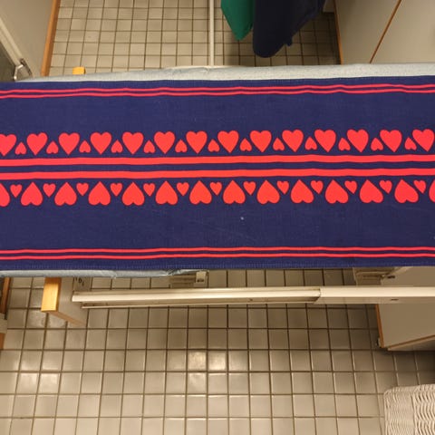 Kaitaliina 100%puuvillaa. Leveys 37cm ja pituus 103cm+8cm. Liinan päädyissä on 4cm hapsut. On