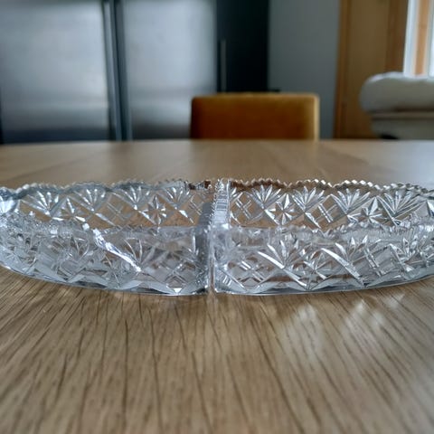 Myydään vanha vene kulho, puristettua lasia. Pituus 25 cm, korkeus 14 cm, leveys 15 cm. Ehjä.