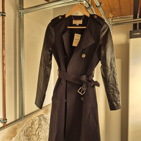 Hyvin vähälle käytölle jäänyt Michael Korsin trenssitakki kokoa S. Silittämällä kuin uusi. Musta hopeanvärisillä yksityiskohdilla.