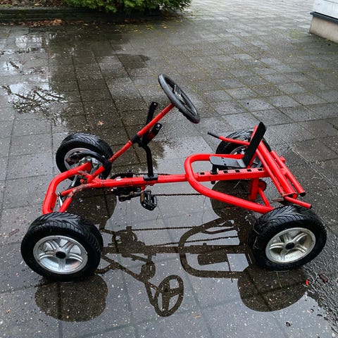 Lasten polkuauto, jossa on musta runko ja punainen istuin. Sopii erinomaisesti ulkoleikkeihin ja kehittää lapsen motorisia taitoja. Vankat renkaat takaavat vakaan ajon erilaisilla pinnoilla. Pientä kunnostusta vailla, ei vaadi erikois osaamista.