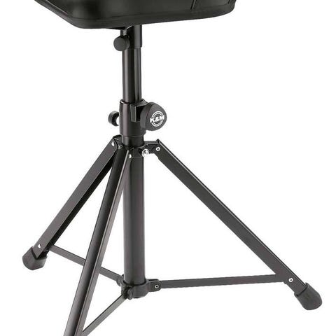 Professional drummer's throne: stable, foldable 3-leg base with fixed large rubber end caps for good floor contact and shock absorption. Optional extra: attachable Spikes 14002. Continuous height adjustment by a notched system with 10 mm steps for a quick and precise height positioning. Locking height adjustment mechanism features a comfortable pull-button and handy clamping lever. Very sturdy and unique rod combination. The detachable seat features an innovative die-cast flange. The seat is wobble-free thanks to a clamping lever which permits a seat rotation from loose to fixed position. The ergonomic seat reduces pressure on the drummer's thighs. Perfect comfort from sophisticated upholstery in black, high quality grained soft imitation leather. As a world-wide first, this drummer's throne has 4 threaded screw sockets on the bottom side of the seat to attach a ButtKicker. Optional extra: holder with tuning key 14001.