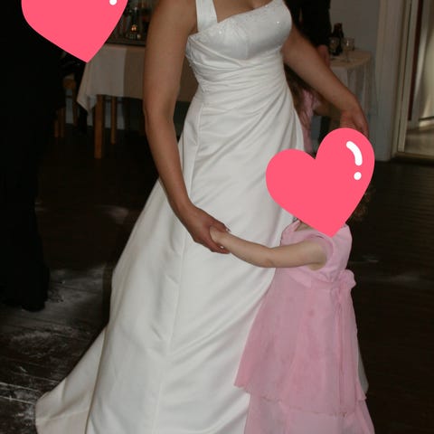 Alun perin Niinattaresta ostettu häämekko. Sopii noin 38-40 kokoiselle. Pesetetty meidän kaksien hääjuhlien välissä mutta nyt edelleen kaipaisi pesua ennen käyttöä. Hieman tummumaa kainaloiden kohdalla, jkv langanvetoja kirjailuissa, sisäkankaassa tummumia. Vannehame mukana.