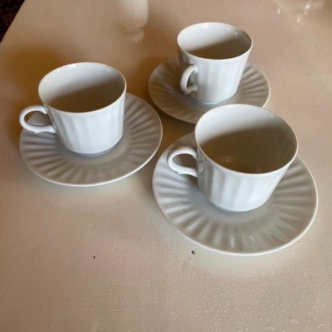 Arviolta 60/70-luvun siro teeastiasto, jossa 5 kpl 1,5 dl kuvioituja kuppeja ja 6 kpl aluslautasta (tassi). Kupeissa vaaleanpunaisia kukkia.