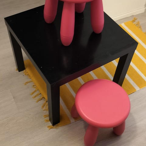 Kuvan mukainen ohuesta vanerista tehty pieni kalusteryhmä. Pöydän kannen korkeus 13 cm. Vanhat. Käteismaksu noudettaessa.