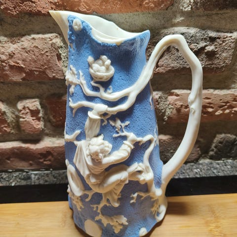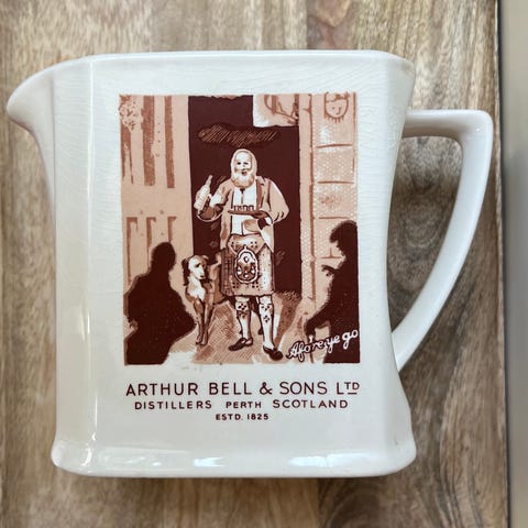 Englannista 1980-luvun alkupuolella ostettu Wade Ceramics -yhtiön valmistama posliininen vesikannu, jossa tekstit, reunus sekä kahva lehtikullattuja. Reunuksen kultaus hieman rikkoutunut, muuten erinomaisessa kunnossa. Korkeus 12cm, pohjan halkaisija 14cm ja suuaukon halkaisija 10cm.