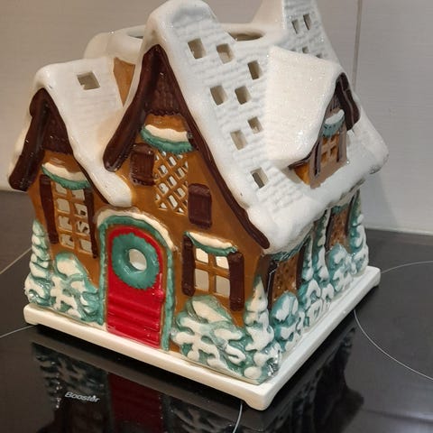 Partylite pieni piparkakkutalo, jonka sisälle saa tuikkukynttilän. Reunan donitsi joskus irronnut ja laitettu pikaliimalla kiinni. Noin 17x17cm, korkeus 14 cm. Nouto Martinlaakso, rikkoutumisvvaaran vuoksi ei postitusta. Käteinen/mb.