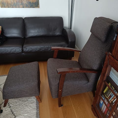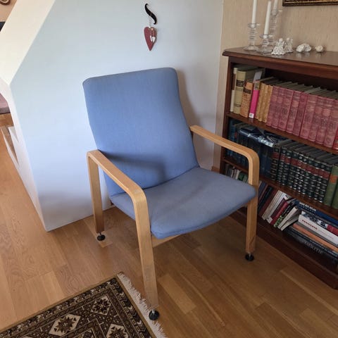 Suomalainen Pohjanmaan.fi merkkinen nojatuoli. Kuvassa näkyy, että hieman pölyttynyt varastossa, mutta hyväkuntoinen.