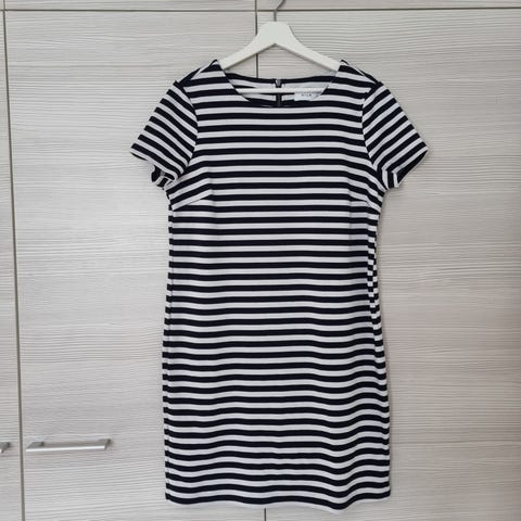 Mekko o harmaassa värissä, koko L. Mekko on valmistettu mukavasta ja kevyestä materiaalista, joka sopii hyvin arkeen tai rentoihin tilaisuuksiin. Raidallinen kuvio antaa tyylikkään ilmeen. Soveltuu hyvin naisten vaatekaappiin monipuolisuutensa ansiosta.