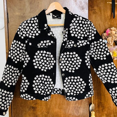 Marimekon farkkutakkimallinen takki, kuosi on Puketti.Taustaväri beige ja kukat valkoiset. Koko 38. Kunto on hyvä.