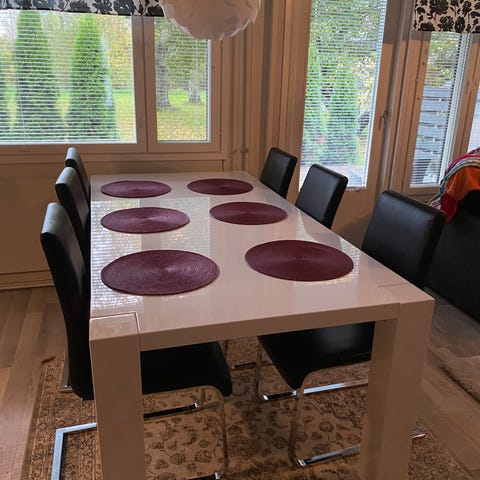 Myydään lankkupöytä ja 2;s tuolia pieneen keittiöön. Pöytä: leveys 60cm, pituus 120cm korkeus 100cm ja lankun paksuus 4cm. Tuolit 2kpl: istuin korkeus 76cm, istuin leveys 40cm ja selkänojan korkeus 25cm. Kuin uusi!!!Hintaan 300;- Seinäjoella
