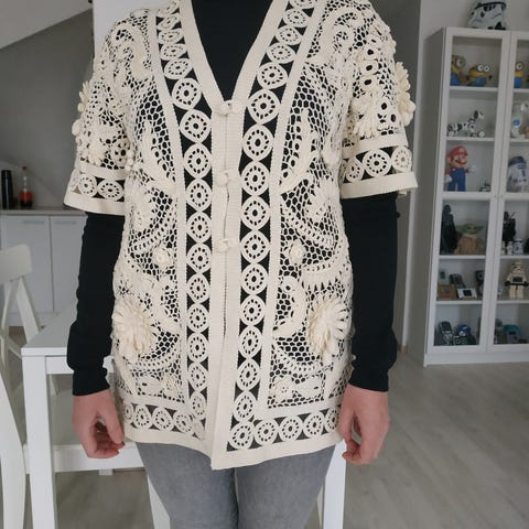 Upea käsinvirkattu beige liivi, koko ~ M 🌟Ulottuu n.polviin asti. Tehty puuvillalangasta.