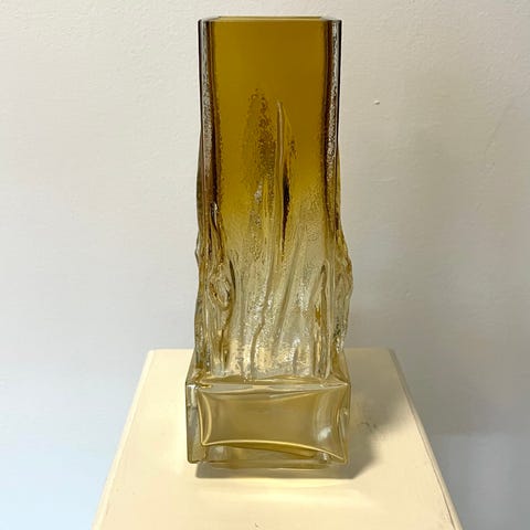 Humppilan Lasin (Eino Vänni) Liekki-sarjan maljakot (2 kpl, eri kokoiset), kynttilänjalat (2 kpl) ja (kukka)malja. Toisessa kynttilänjalassa pieni (about 3 mm) stiplu, muutoin ehjiä. Tarrat osin jäljellä, poistettavissa helposti.