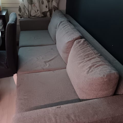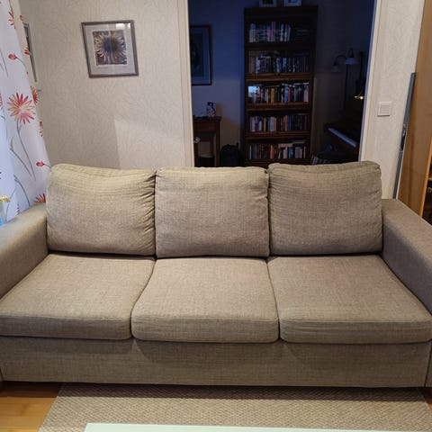 Annetaan tarpeeton sohva, jonka saa vuoteeksi. Mitat yllä, kova on nukkua mutta hätävarana toiminut. Muutoin siisti ja ollut sisätiloissa.