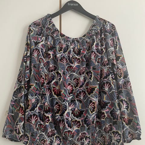 Vila Floral pusero naisille. Koko L, väriltään kirjava, sisältäen sinisen ja beigen sävyjä. Materiaalina 95% polyesteriä ja 5% elastaania. Sopii hyvin rentoon tai muodollisempaan pukeutumiseen. Puolipitkät hihat, v-aukkoinen kaulus. Mitat: kai-kai n.60cm. pit.n.80cm.