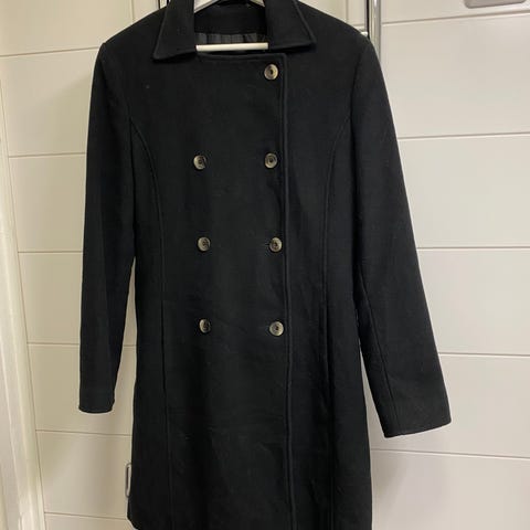 Pirettan luonnonvalkoinen/kermanvalkoinen villakangastakki kultaisin napein. Valmistettu Suomessa, 100% uutta villaa. Koko 40 / M. Kai-kai 51cm ja hartia-helma 93cm. Hyvin klassinen ja ajaton malli.
