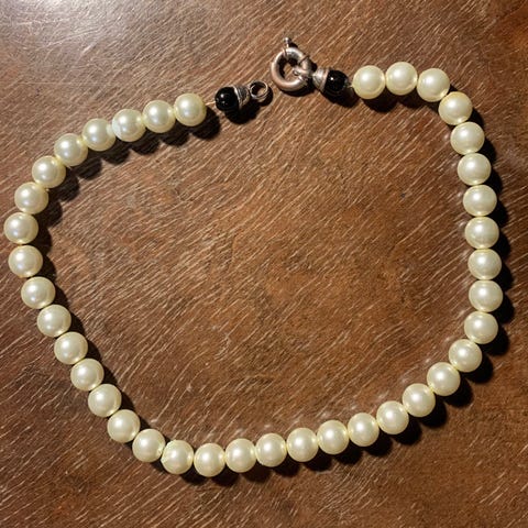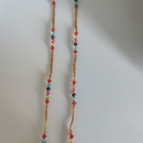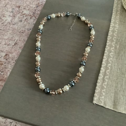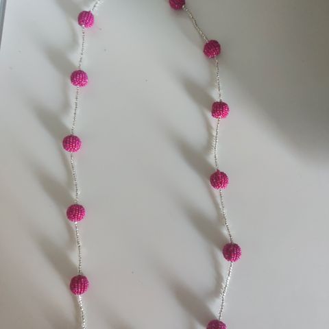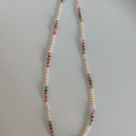 Myydään kaulakoru. Materiaaleina lasihelmet sekä makeanveden helmet. Lasihelmet aniliininpunaiset sekä läpinäkyvät. Makeanveden helmet vaaleat.