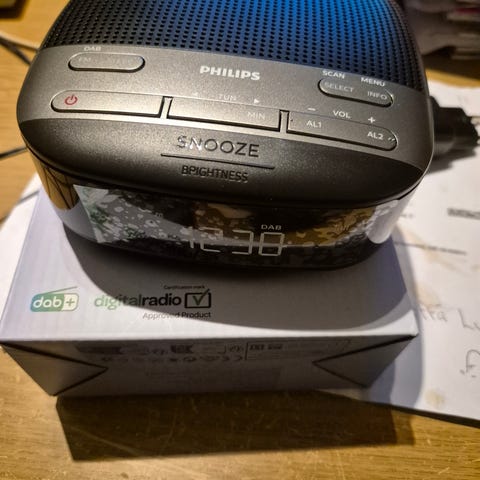 Sekä verkkovirralla että pattereilla (2×AAA) toimiva LED-näytöllinen kelloradio.