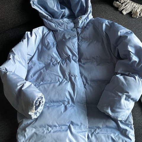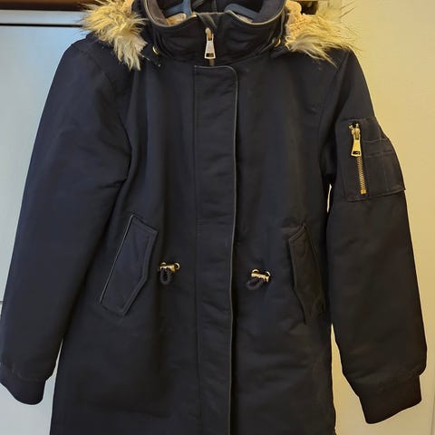 H&M Talvitakki naisille, koko 34. Takki on sininen ja sopii talvikäyttöön. Teddyvuori. Pinta kangasta. Ei vedenpitävää. Takissa on useita taskuja ja huppu lisäsuojaa varten. Vetoketju ja napit. Helmassa nyörit. Divided. Siisti ja ehjä.
