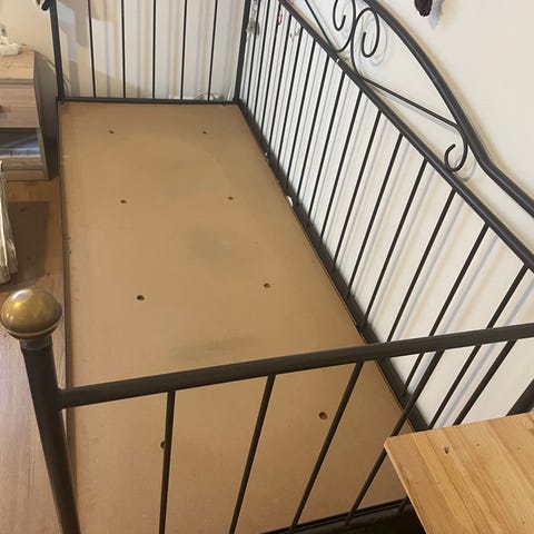 Pehmeä sänky , sininen väri. Kestävä rakenne ja metalliset sityiskohdat. Sopii matkustamiseen ja helppo kuljettaa pyörien ansiosta.