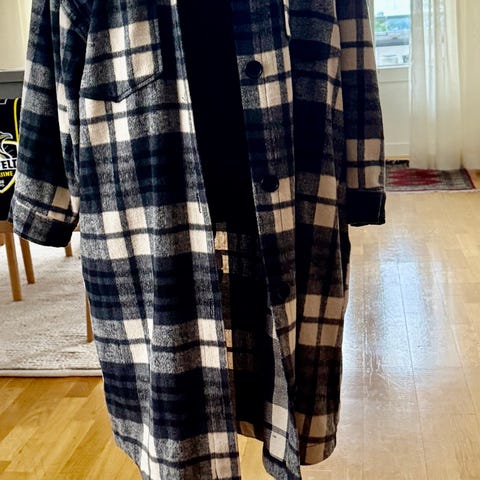 Pitkä takki, siisti ja hyvässä kunnossa, koko L. Mitat: kai-kai 57cm, pituus 94cm