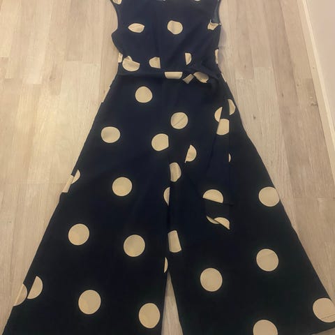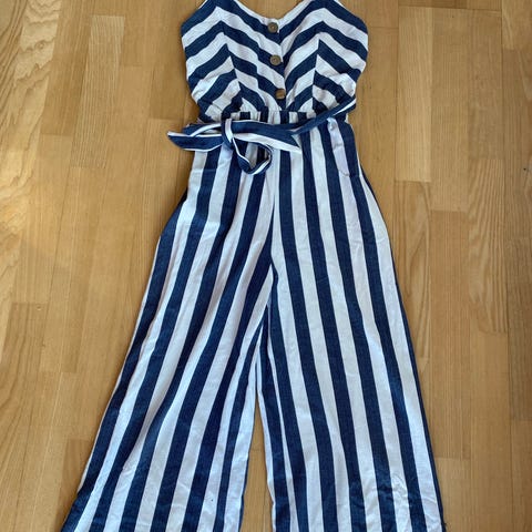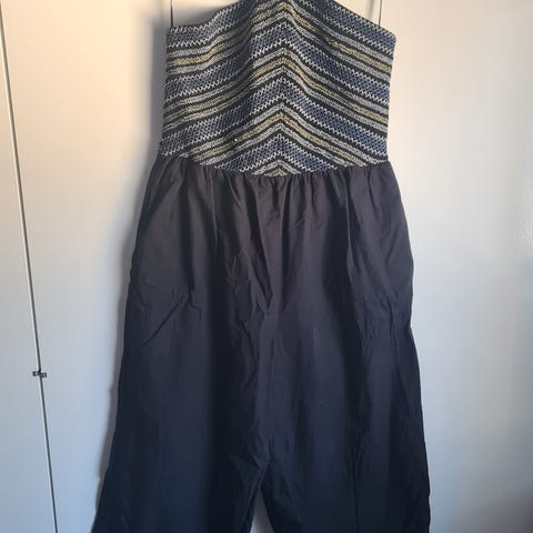 Kerran juhlissa ollut jumpsuit. Vaaleansininen, 100%viskoosi. One size, vastaa L/40-42. Höyhenen kevyt, laskeutuva kangas. Säädettävät olkaimet. Vyötärön kohdalla joustava trikookaistale. Alaosa epäsymmetrinen, pitkät halkiot sivuilla. Kuminauha jousto etuosan rinnuksella. Hulmuavan kaunis päällä.