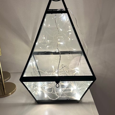 Lasia ja metallia. Toimii paristoilla. Korkeus 31 cm , halkaisija 13,5 cm. Ostettu jostain sisustusliikkeestä, lähinnä kerännyt pölyä sen jälkeen. Kulkeutuu Turun suunnalle omien menojeni mukaan. Katso myös muut kohteeni.