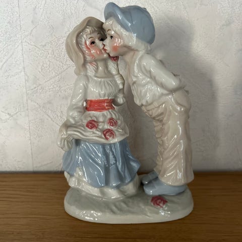 Upea ja harvinainen hääpari -aiheinen keramiikkafiguuri on valmistettu Suomessa Falco-nimisessä keramiikkapajassa, joka toimi 1950–1970-luvuilla.