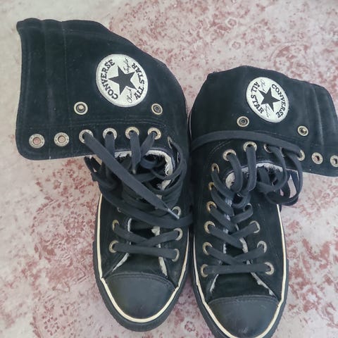 Ihanimmat Converse tennarit, Chuck Taylor All Star Lift, väri Himalayan (vaalean violetti). Olleet ilmeisesti kaupan esittelykappale hintalaput paikallaan, mutta pieniä jälkiä pohjissa ehkä sovituksesta. Hintalapussa koko 7, mutta kengän pohjassa 5. Sisäpohjan mitta on noin 23,5cm. Sanoisin, että vastaa kokoa 38.