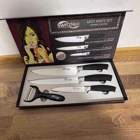 1/2 tusinaa sahalaitateräsiä veitsiä, pituus 21.5 cm on helppo ottaa ja säilyttää magneetein varustetulla teakpuisella alustalla, koko 14,5 x 23 cm. joko vaaka- tai pystyasennossa. Veitsien terät ovat ruostumatonta terästä, valmistusmaa on Taiwan.