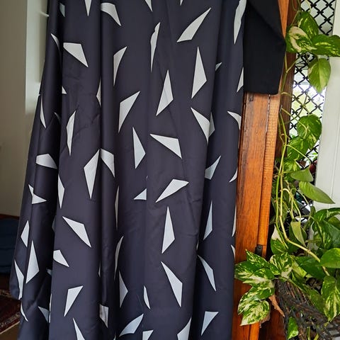 Marimekon puuvillasatiini kaitaliina, valkoinen pohjaväri ja kullanvärinen kuvio. Koko 48×136cm. Printti mielestäni "Fandango". Käytetty kerran juhlissa, ei pesty - muutaman pienen pistetahran löysin, luultavasti kahvia. Muuten siisti.