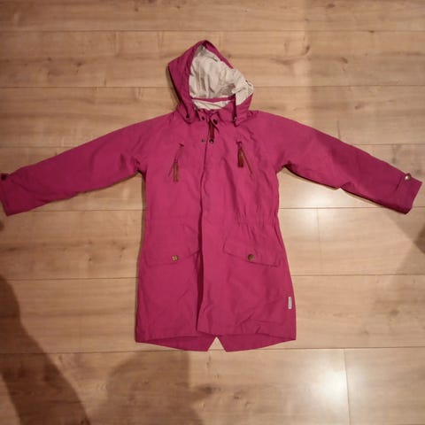 Erinomaisessa kunnossa oleva välilausitakki / välikausianorakki koossa 140 cm. Olisin valinnut kuntoluokitukseksi "kuin uusi", mutta havaitsin takin tarkkaan syynätessäni, että toisessa hihassa on huomaamattomassa paikassa haalea värjäymä, joten kunnoksi hyvä. Muutoin ei mitään moitittavaa.