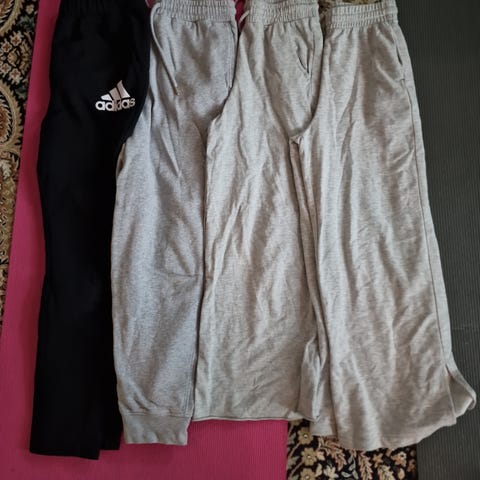 - Adidas collegekankaiset housut. Runsaasti pesunukkaa, ehkä myös hieman kulumaa polvissa.