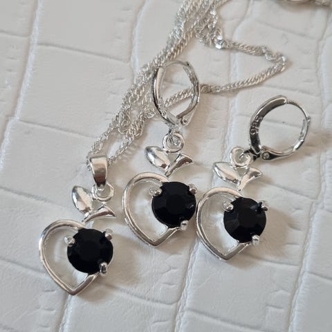 Hopean värinen korusetti korvakorut+kaulakoru, jossa on hopeanvärisiä ja mustia yksityiskohtia. Kaulakorussa on ketju ja koristeellisia riipuksia. Korvakorut ovat yksinkertaiset hopearenkaat joissa pieniä timantteja. Sopii hyvin juhla- tai arkipukeutumiseen.