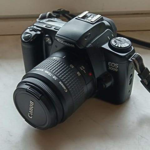 Huolellisella käytöllä ollut Canon filmikamera ja säilytyslaukku.