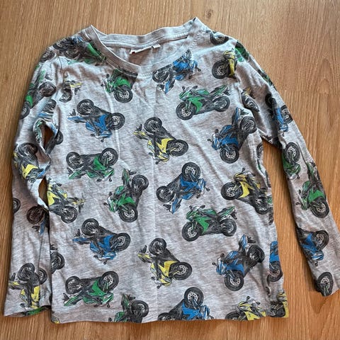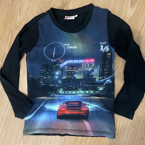 Kotimaisen Sampsukan (www.sampsukka.com) hauska trikoopaita, jossa harmaalla pohjalla värikkäitä ralliautoja. Koko 130 cm. Tämä paita oli meidän pojan ehdoton lemppari, mutta on edelleen ehjä ja hyväkuntoinen. Yhden pienen hailakan tahran löysin etupuolelta, mutta sitä ei oikein edes huomaa kuvioinnin seasta (ks. toinen kuva, tahra on punaisen auton ”savupilven” kohdalla).