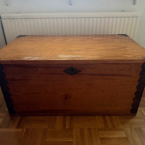 Vanha puinen säilytysarkku. Sisältää avaimen. Ajan patinoima. Korkes 47 cm, leveys 85 cm ja syvyys 51 cm