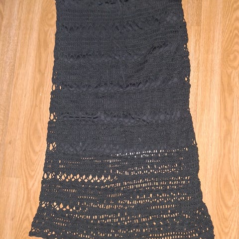 Lähes käyttämätön läpinäkyvä neulostunika. Täyspitkät levenevät hihat, joissa alaosassa pitsikuvio. Olka-helma 90cm, kainalo-kainalo 55cm. Hihan pituus noin 66cm. Akryylia, pitsit puuvillaa.