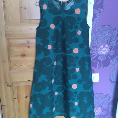 Marimekon tosi kaunis rahtu kissapöllö mekko. Materiaali on 100% puuvillaa. Tosi juhlava ja kaunis materiaali. Alusmekko 96% polyetseri, 4% elastaani. Sivuilla taskut, piilovetoketju takana, 3/4 hihat. Koko 38, materiaali ei jousta. Kai-kai 53cm, olka-helma 91 cm. Erinomainen kunto.