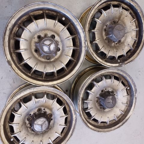 Mangels vanteet 6x14 tuumaiset 5x112 jaolla. Ovat luultavasti olleet mercedes w123:n alla. Valm.vuosi 1983. Kromi ei ole virheetön. Kaikki keskikupit tallella.