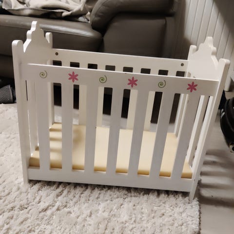 Myyntiin elämää nähnyt ja leikkejä kokenut nuken sänky. Yksi pohjan kannaketappi ei nyt löytynyt, muuten tukeva. Pohjan voi laittaa kahteen eri korkeuteen.