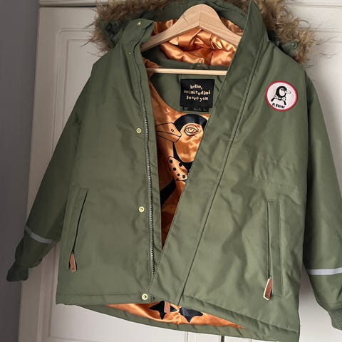 Ehkä ja hyvä takki seuraavalle. Haaleaa värjäymää erityisesti edessä (ks kuva) ja ripustuslenksun toinen pää irronnut. Hihoissa nukkaa ja näkyy käytön jälkiä (ks kuva).