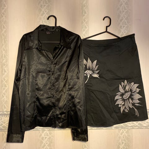 Kevyt marjapuuron värinen juhla-asu,jossa toppi,hame ja jakku.Made on Finland (Turku)
