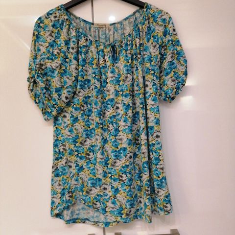 Tokmannilta ostettu.. Hyväkuntoinen, mutta jossain kohtaa hieman pesuhaituvaa. Liukaspintainen joustava kangas. Kaunis. Rypytykset.