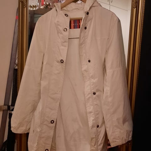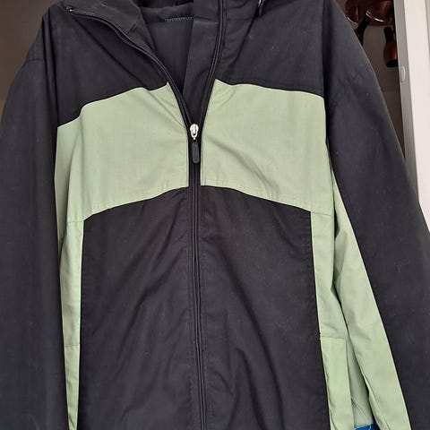 Takin kai-kai pituus noin 55 cm. Takissa vetoketjusivutaskut ja vetoketjullinen povitasku, helmassa ja hupussa säädettävät kiristyskuminauhat, hihansuissa resorit, joissa kiristystarranauha osin irronnut, katso viimeisin kuva. Takin oikeassa kainalossa pieni ratkeama, on korjattavissa, katso kuva.