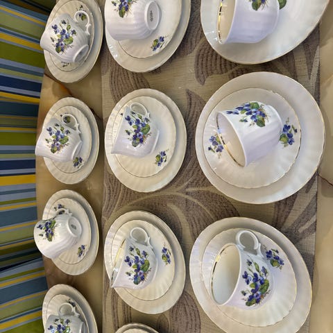 Kukka/ perhos kahvimukit ja lautaset telineessä. 6 kpl. Käyttämättömät.