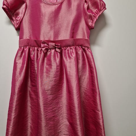 Kaunis pikkutytön juhlamekko pehmeän ruusunpunaisessa värissä, jossa on kimaltelevia yksityiskohtia.