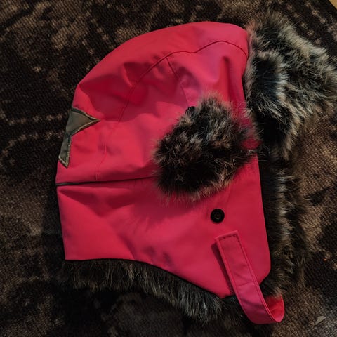 - Luppaset vaaleanpunainen puuvillapipo nahkakorvilla, siisti kunto, koko XL, ollut käytössä noin 2-4v, 4e