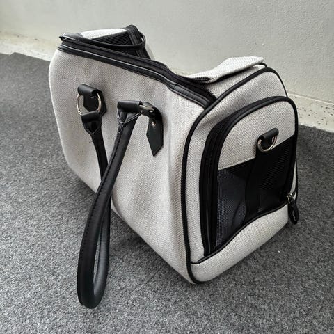 Lemmikkikantolaukku, joka on musta ja harmaa. Laukku on varustettu vetoketjulla ja siinä on hengitysaukot. Sopii pienten lemmikkien kuljettamiseen. Materiaali on kestävä ja helppo puhdistaa.