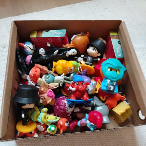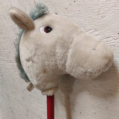 Soiva keppihevonen, meikauspää, Minni Hiiri -laukku ja muutamat pehmolelut.