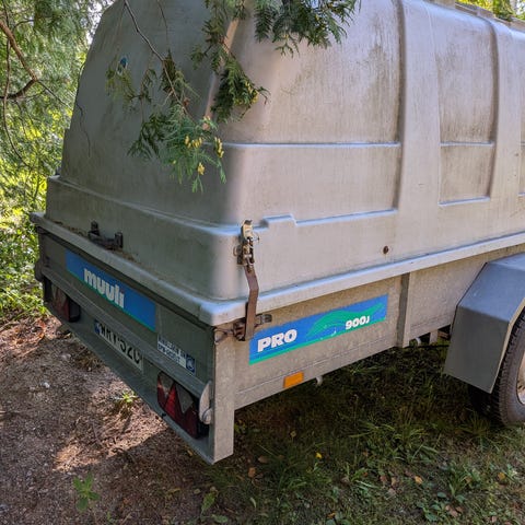 Siitä koppikärry irrotettavalla katteella, oli alkujaan kiinteä puurunkoinen kate, puut oli lahonnut, tehty huonekaluputkesta uusi runko katteella. Jarrut, vetokita ja laakerit uusittu joitain vuosia sitten. Vahva hitsattu runko, 30mm paksu vaneri ja jarrullinen akseli. Vähällä käytöllä ollut.